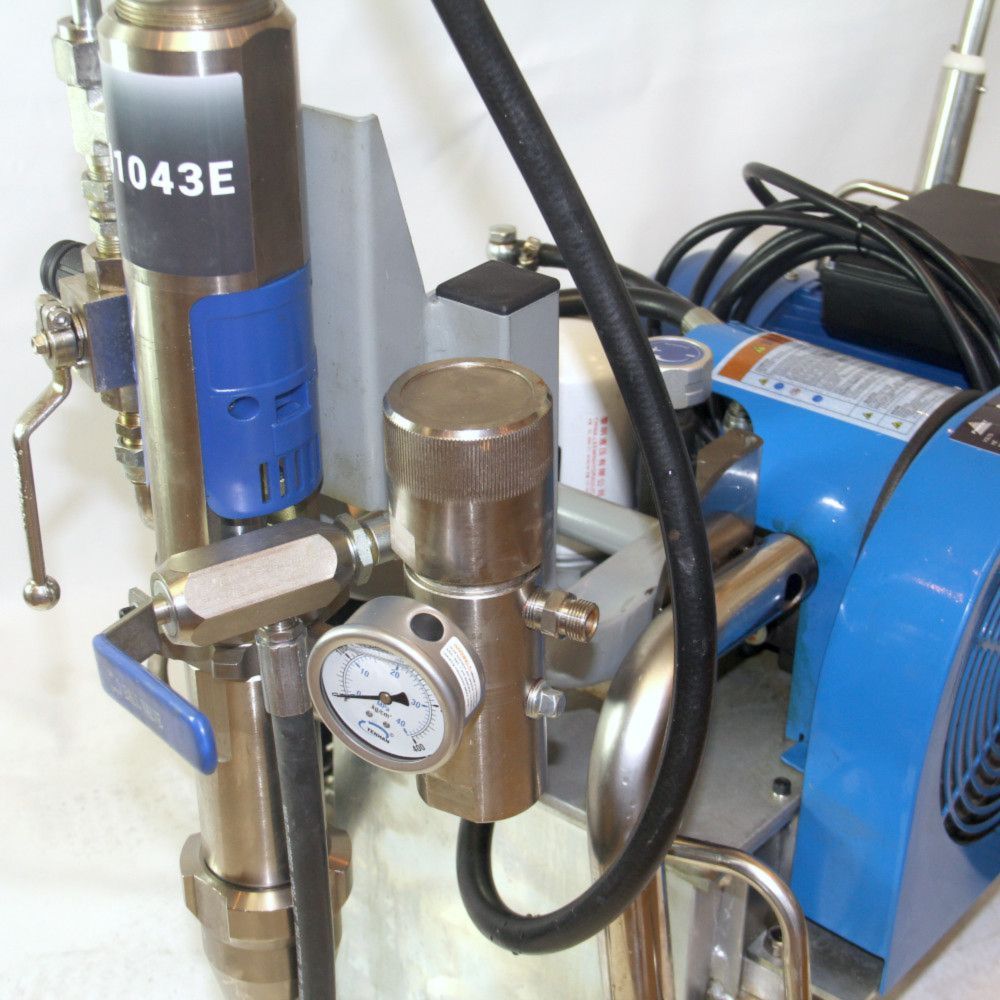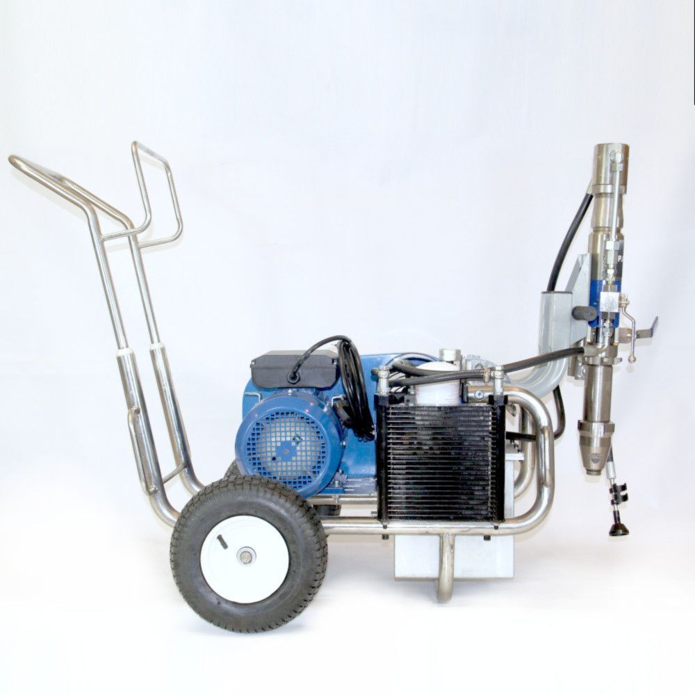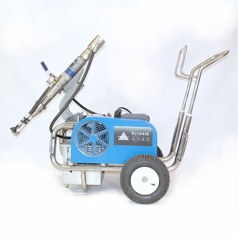 Безвоздушный окрасочный аппарат PremJet PJ 1043E с электрическим приводом и пневматическим насосом предназначен для профессионального применения ЛКМ высокой вязкости с содержанием абразивов для грунтования и окраса больших объёмов в промышленности и на производстве, для нанесения полимерной шпатлёвки, огнезащитных и двух компонентных составов с одновременным применением двух краскораспылителей.