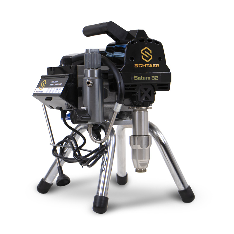 Sсhtaer Saturn 32 — окрасочный аппарат безвоздушного распыления используется для работы на строительной площадке, для покраски фасадов, стен и потолков, грунтовки и окраски металлоконструкций, и покраски деревянных стен и заборов. Поршневой окрасочный аппарат забирает краску из ведра и подает ее по шлангу высокого давления на краскопульт.